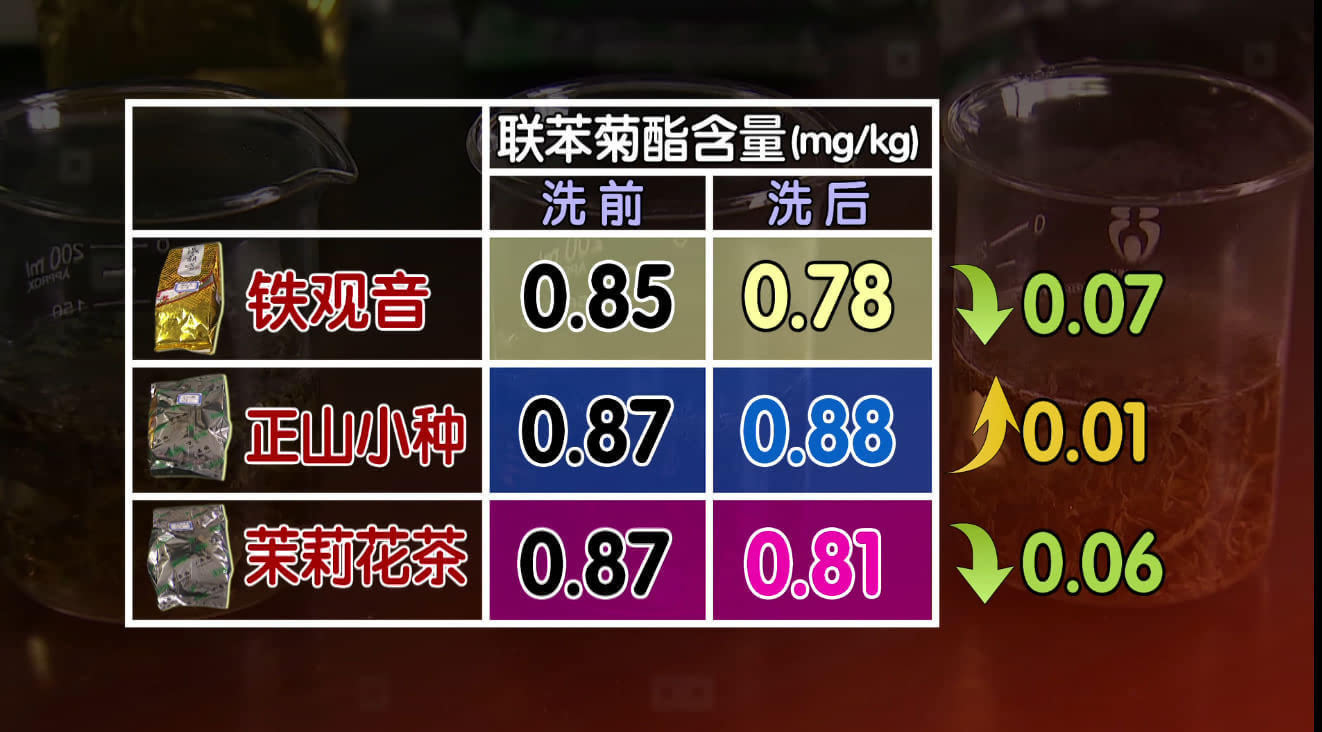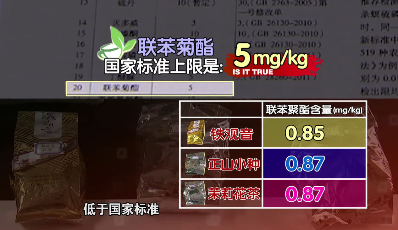 检测结果显示铁观音联苯菊酯的含量为0.85毫克/千克、正山小种含量为0.87毫克/千克、茉莉花茶含量为0.87毫克/千克,远低于最高残留限量5毫克/千克的国家标准。