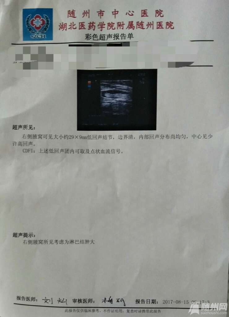 妈妈因自己触摸到腋下有个包块,到长岭镇卫生院就诊,医生建议到上级医院做个穿刺。当天就去了随州人民医院,挂介入外科!医生说只需要做个b超,没有必要做穿刺!医生怎么说我们就怎么做!因为做b超的人太多,排到了第二天,第二天拿到结果以后,就拿去给医生看,介入外科的医生不在,就给综合门诊的医生看,医生说没事就是淋巴结肿大!