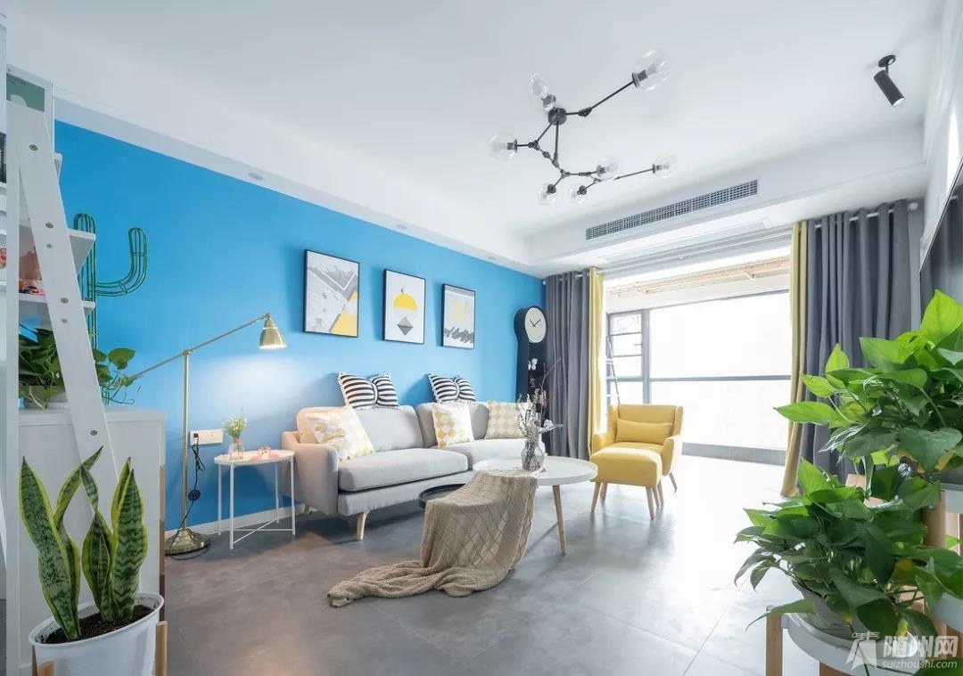 ▲ 客厅,灰色的简约水泥地砖,分子式的吊灯,简约而不简单的北欧风格。蓝色的背景墙,让人眼前一亮的同时更是提升了空间的色彩明艳度。