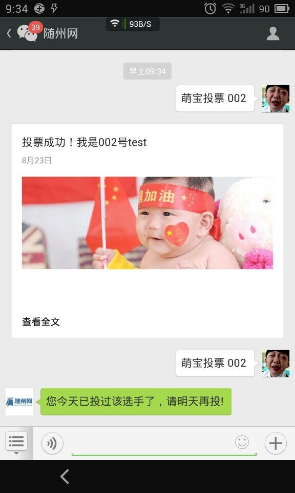 2、给随州网微信回复:萌宝投票 001(后面的编号是你要支持的宝贝)